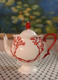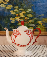 Галине Шуляк удалось создать неожиданно гармоничное произведение, расположив яркие неровные линии кораллов на плавных изгибах белоснежного фарфора.