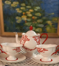 Декор сервиза наводит на мысли об искусстве художников востока. Крутой изгиб алой ручки перекидывается над поверхностью чашечки, словно изящный красный мостик в традиционном японском саду.