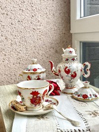 Чайник изготовлен на Императорском фарфоровом заводе из твердого фарфора. Форма отливается вручную. Для декорирования используется ручная надглазурная роспись. Автор рисунка - Лариса Григорьева, автор формы - Тамара Беспалова-Михалева. Выпуск изделия начался в 1975 году. Объем - 480 мл, высота - 18.4 см.
