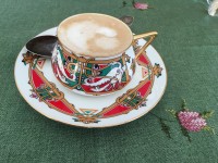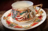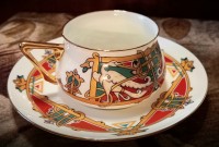 Чашка с блюдцем изготовлена на Императорском фарфоровом заводе (г. Санкт-Петербург) из тонкостенного костяного фарфора. Для декорирования используется надглазурная деколь, отводка золотом. Объем чашки - 180 мл, высота - 5 см, диаметр блюдца - 14.6 см. Обратите внимание, объем измеряется от дна до верхнего края изделия, полезный объем может быть на 10-15% меньше заявленного производителем.
