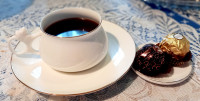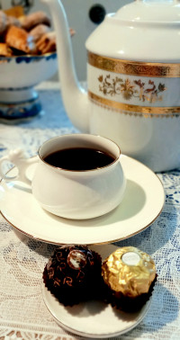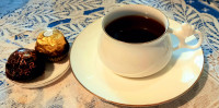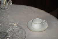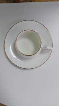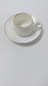 Чашка с блюдцем изготовлена на Императорском фарфоровом заводе (г. Санкт-Петербург) из тонкостенного костяного фарфора. Для декорирования используется отводка золотом. Объем чашки - 180 мл, высота - 5 см, диаметр блюдца - 14.6 см. Обратите внимание, объем измеряется от дна до верхнего края изделия, полезный объем может быть на 10-15% меньше заявленного производителем.