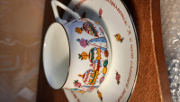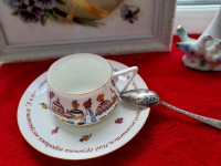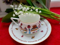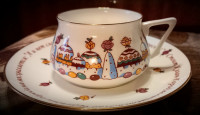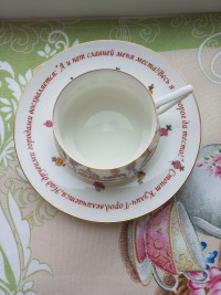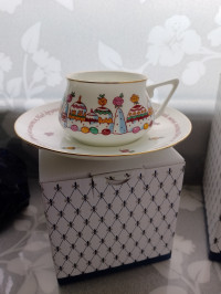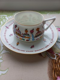 Чашка с блюдцем изготовлена на Императорском фарфоровом заводе (г. Санкт-Петербург) из тонкостенного костяного фарфора. Для декорирования используется надглазурная деколь, отводка золотом. Объем чашки - 180 мл, высота - 5 см, диаметр блюдца - 14.6 см. Обратите внимание, объем измеряется от дна до верхнего края изделия, полезный объем может быть на 10-15% меньше заявленного производителем.