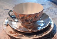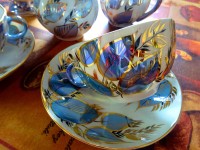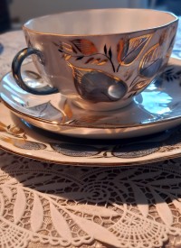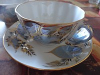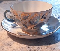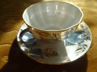 Чашка с блюдцем изготовлена на Императорском фарфоровом заводе (г. Санкт-Петербург) из классического твердого фарфора. Для декорирования используется надглазурная деколь, роспись золотом. Объем чашки - 250 мл, высота - 5.8 см, диаметр блюдца - 15 см. Обратите внимание, объем измеряется от дна до верхнего края изделия, полезный объем может быть на 10-15% меньше заявленного производителем.