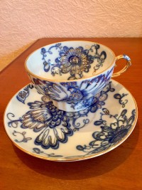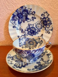 Чашка с блюдцем изготовлена на Императорском фарфоровом заводе (г. Санкт-Петербург) из классического твердого фарфора. Для декорирования используется подглазурная деколь, роспись золотом. Объем чашки - 230 мл, высота - 5.9 см, диаметр блюдца - 14.6 см. Обратите внимание, объем измеряется от дна до верхнего края изделия, полезный объем может быть на 10-15% меньше заявленного производителем.