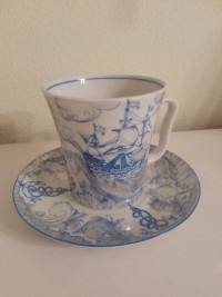 Бокал с блюдцем изготовлен на Императорском фарфоровом заводе из твердого фарфора. Для декорирования используется надглазурная деколь и роспись люстровыми красками. Автор рисунка - Нина Славина, автор формы - Эдуард Криммер. Объем бокала - 360 мл, высота - 9.5 см.