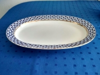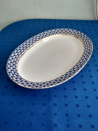 Блюдо изготовлено на Императорском фарфоровом заводе из твердого фарфора. Для декорирования используется подглазурная деколь, роспись золотом. Автор рисунка - Анна Яцкевич, автор формы - Анна Лепорская. Размер - 35 см х 24 см.