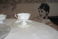 Чашка с блюдцем и тарелкой изготовлена на Императорском фарфоровом заводе (г. Санкт-Петербург) из тонкостенного костяного фарфора. Форма отливается вручную. Для декорирования используется ручная надглазурная роспись. Объем чашки - 220 мл, высота - 7.4 см, диаметр блюдца - 14.8 см, диаметр тарелки - 18 см. Обратите внимание, объем измеряется от дна до верхнего края изделия, полезный объем может быть на 10-15% меньше заявленного производителем.