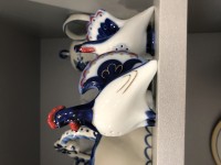 Перечница изготовлена на Императорском фарфоровом заводе из твердого фарфора. Для декорирования используется ручная подглазурная и надглазурная роспись. Автор формы и рисунка - Михаил Мох. Выпуск изделия начался в 1959 году. Высота - 9.5 см. Обратите внимание! Изделие продается без затычки/пробки.