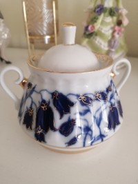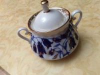 Сахарница изготовлена на Императорском фарфоровом заводе из твердого фарфора. Форма отливается вручную. Для декорирования используется подглазурная деколь, роспись золотом. Автор формы и рисунка - Нина Славина. Выпуск изделия начался в 1970-х годах. Объем - 300 мл, высота - 10.6 см.