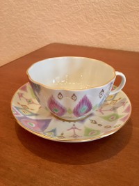 Тонкий костяной фарфор чайной пары. Нежный рисунок. Купила по акции, поэтому довольна приобретением.