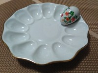 Блюдо имеет круглую форму с фигурным краем и 12 ячейками. В них можно разместить фаршированные или отварные яйца, а также окрашенные яйца категорий С1–С2 (небольшие, стандартные). В центре расположено круглое «зеркало» диаметром 9 см, на которое удобно поставить пасху или небольшой кулич.