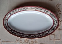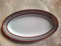 Блюдо изготовлено на Императорском фарфоровом заводе из твердого фарфора. Для декорирования используется надглазурная деколь, отводка золотом. Автор рисунка - Любовь Цветкова по мотивам "Бабигонского" сервиза (1824 год).Размер - 23.4 см х 13.8 см.