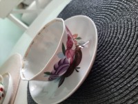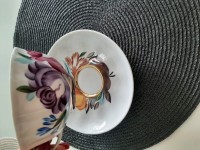 Чашка с блюдцем изготовлена на Дулевском фарфоровом заводе (г. Ликино-Дулево, Московская область) с декорированием ручной надглазурной росписью красками и золотом. Чашка выполнена из легкого тонкостенного твердого фарфора, блюдце изготовлено из классического твердого фарфора. Объем чашки - 220 мл, высота чашки - 5 см, диаметр блюдца - 15 см. Обратите внимание, объем измеряется от дна до верхнего края изделия, полезный объем может быть на 10-15% меньше заявленного производителем.