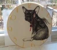 Часы изготовлены на частной фарфоровой мануфактуре из твердого фарфора по заказу петербургской галереи Otherwise. Для декорирования используется надглазурная деколь. Диаметр тарелки - 27 см. На обратной стороне тарелки находится часовой механизм "Quartz" с питанием от пальчиковых батареек и крючком для подвешивания тарелки. Подарочная упаковка.