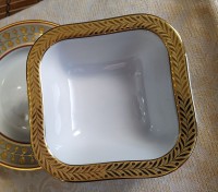 Салатник изготовлен на Императорском фарфоровом заводе из твердого фарфора. Для декорирования используется надглазурная деколь. Автор рисунка - Любовь Цветкова по мотивам "Бабигонского" сервиза (1824 год), автор формы - Анна Лепорская. Объем - 700 мл, высота - 6.7 см.