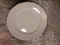 Тарелка изготовлена на Добрушском фарфоровом заводе (г. Добруш, Республика Беларусь) из классического твердого фарфора без декора. Диаметр тарелки - 17.5 см. Допускается отклонение в диаметре не более 5 мм в связи с особенностью производства. По бортику нанесен небольшой рельефный рисунок в виде вензелей.