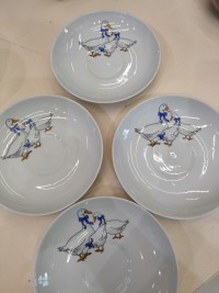 Блюдце изготовлено на Дулевском фарфоровом заводе (г. Ликино-Дулево, Московская область) из классического твердого фарфора с декорированием надглазурной деколью. Диаметр блюдца - 14 см.